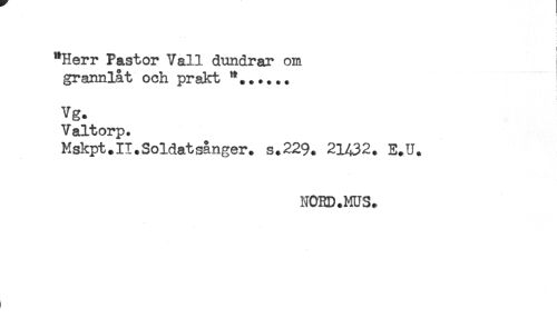 //// "Herr Pastor Vall dundrar om //// grannlåt och prakt //// Vg. //// Valtorp. //// Mskpt.II+Soldatsånger. s.229. 21432. E.U. //// NORD.MUS+ ////