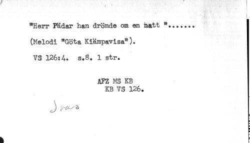 //// "Herr Pädar han drömde om en hatt "....... //// (Melodi "Göta Kiämpavisa"). //// < //// VS 126:4. S.8. 1 str. //// AFZ MS KB //// KB VS 126. //// < //// < ////