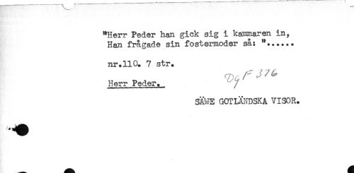//// "Herr Peder han gick sig i kammaren in. //// Han frågade sin fostermoder så: "...... //// nr.110. 7 str. //// Herr Peder. / //// SAME GOTLÄNDSKA VISOR. ////