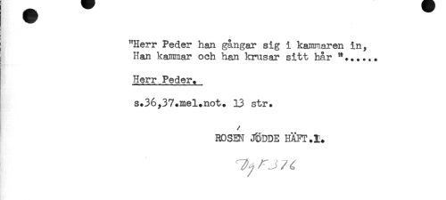 //// "Herr Peder han gångar sig i kammaren in, //// Han kammar och han krusar sitt hår //// Herr Peder. //// s.36,37*mel.not. 13 str. //// ROSEN J&DDE HÄFT.I. ////