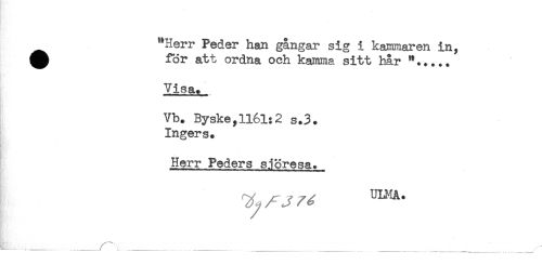 //// "Herr Peder han gångar sig i kammaren in, //// ^ för att ordna och kamma sitt hår "*.... //// Visa. //// Vb. Byske,1161:2 s.3. //// Ingers* //// Herr Peders sjöresa. //// ^^ ULMA. //// / //// ___ _____ /..... .__ _ _ _ _ ////