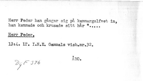 //// - //// Herr Peder han gångar sig på kammargolf vet in, //// han kammade och krusade sitt hår //// Herr Peder^ //// 13:4. LT. I.N.E. Gammals visb+nr.32. //// ÅBO. ////