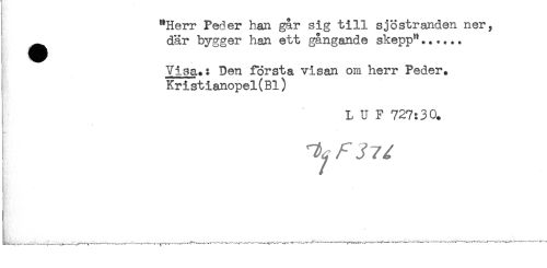//// "Herr Peder han går sig till sjöstranden ner, //// ^ där bygger han ett gångande skepp"...... //// Visa.: Den första visan om herr Peder. //// Kristianopel(Bl) //// L U F 727:30. //// ^.............^.........-...........-............-....... ////