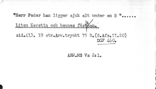 //// "Herr Peder han ligger sjuk alt under en o //// Liten Kerstin och hennes fastan. //// sid+413. 19 str.Arw.trvckt 75 B.(G.Afz.IIt20) //// DGF 460. //// i //// ÅHV.MS Vs 2:1. //// F //// S //// - //// H //// a //// H ////