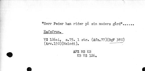 //// . //// "Herr Peder han rider på sin moders gård"*..... //// - //// - //// * - . - : //// Hafsfrun. //// -------^ //// VS 126:4. s.75. 1 str. (Afz.77)(DgF 380) //// (Arw.150) (Melodi). ---T //// __AFZ MS KB //// ^ KB VS 126. ////