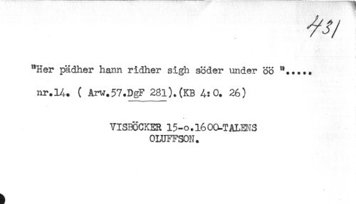 //// I //// "Her pädher hann ridher sigh söder under öö //// nr.lA. ( Arv.57.DgF 28l).(KB A: O. 26) //// VISBÖCKER 15-O.1600-TALENS //// OLUFFSON. ////