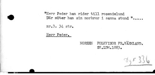 //// ^ "Herr Peder han rider till rosendelund //// l^y Där möter han sin morbror i samma stund ** + .... //// nr.3. 34 str. //// .v ' //// Herr Peder. //// NOREBJ FOLKVISOR FR.VÄRMLAND. //// SV.LDM.1883. ////