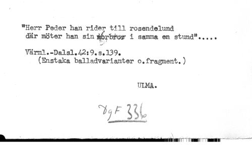 //// "Herr Peder han rider till rosendelund //// där möter han sin m^rb^öar i samma en stund"..... //// t- /T //// *!/ärnl.-Dalsl.A2:9.s.l39. //// (Enstaka balladvarianter o.fragment.) //// ULMA. ////