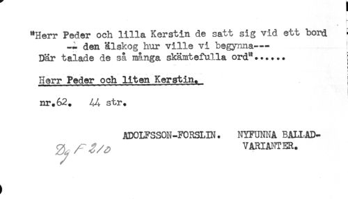 //// * t //// "Herr Peder och lilla Kerstin de satt sig vid ett bord ^ //// -*. den älskog hur ville vi begynna-- ' //// Där talade de så inånga skämtefulla ord"...... ) //// ... < f //// : //// Herr Peder och liten Kerstin. ; //// nr.62. str. //// ADOLFSSOH-FORSLIN. NYFUNNA BALLAD- //// VARIANTER. ////