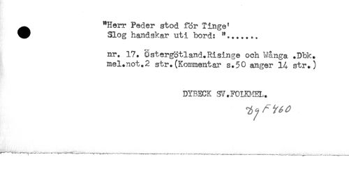 //// ^ "Herr Peder stod för Tinge* //// ^ Slog handskar uti bords //// nr. 17. Sstergötland.Risinge och Många .Dbk. //// mel.not.2 str.(Kommentar s.50 anger 14 str.) //// DYBECK SV.FOLKMEL. ////