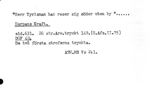 //// "Herr Tyrisman han reser sig söder utom by "...... //// Harpans Kraft._ //// sid.631. 26 str.Arw.tryckt 149.(C.Afz.II.75) //// De två första stroferna tryckta. //// AHJ.MS Vs 2:1. ////
