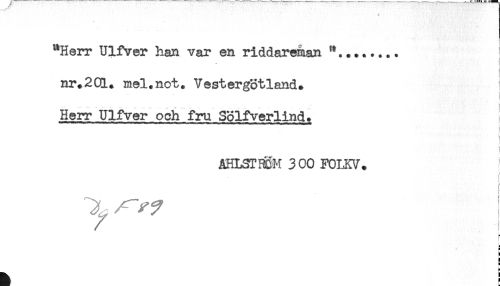 //// "Herr Ulfver han var en riddareman //// nr.2Ql. mel.not. Vestergotland. //// Herr Ulfver och fru Solfverlind* ! //// t //// ÄHLSTI^M 300 FOLKV. //// / //// l //// ! //// ^ ! ////