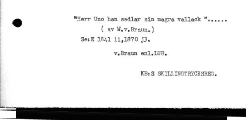 //// ^^ "Herr Uno han sadlar sin magra vallack //// t ( av W.v.Braun*) //// 3e:E 1841 ii, 1870 //// i v.Brann enl.LUB. //// KB:S SKILLINGTRYCKSREG. ////