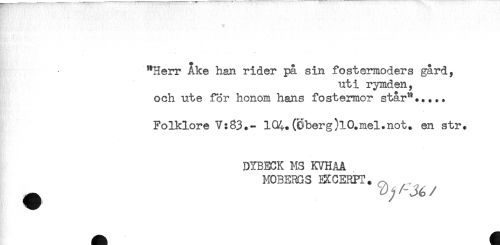 //// "Herr Åke han rider på sin fosternoders gård, //// uti rymden, //// och ute för honom hans fostermor står"..... //// Folklore V:83.- 104. (Cberg)l0.mel.not. en str. //// DYBECK MS KVHAA //// MOBERGS EKCERPT. ,. ^ ////