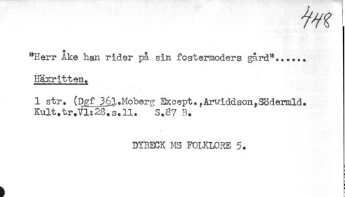 //// "Herr Ake han rider på sin fostermoders gård"...... //// Häxritten. //// ** * //// 1 str. (Dgf_j6l.Moberg Except. .Ar%viddson,Södermld. //// Kult.tr.Vl:28.s.ll. S.87 B. //// DYBECK MS FOIKLORE 5. ////