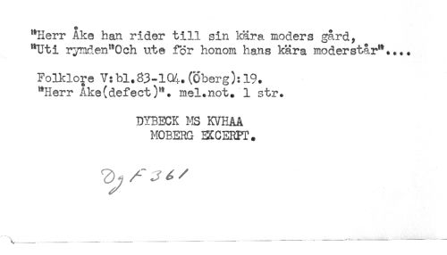 //// "Herr Åke ban rider till sin kära. moders gård, //// "Uti rymden"Och ute för honom hans kära moderstår".... //// Folklore V:bl.83-1Q4. (Öberg): 19. //// "Herr Ake(defect)". mel.not. 1 str. //// DYBECK MS KVHAA //// MOBERG EKCERFT. ////