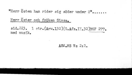 //// ! //// "Herr Osten han rider sig söder under 8"....... //// t //// ! //// Herr Sster och fröken Sissa. ^ //// sid.223. 1 str.(Årw.l32)(G.Åfz.II.32)DGF 277. //// med musik. "-' //// < //// * //// i //// t //// ABM.MS Vs 2:2. //// j //// j //// ) ////