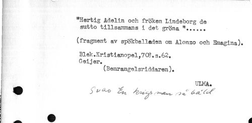 //// i "Hertig Adelin och fröken Lindeborg de //// j sutto tillsammans i det gröna "...... //// ] (fragment av spökballaden om Alonzo och Emagina). //// Blek.Kri stianopel, 7 . s. 62. //// j Oeijer. //// I (Benrangelsriddaren). //// j ULMA. ////