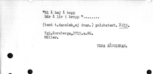 //// **Hi å hej å hopp //// här å liv i kropp //// (text t.danslek,ej dram.) polsket^rt. 2)215+ //// Vgl. Kor sber ga 715.s.86. //// Möller. //// ULMA SÄI-IGLEKAR. //// < ////