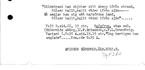 //// "Hildebrand han skjuter sitt skepp ifrån strand. //// Blåser kallt,kallt väder ifrån sjön--- //// ^ Så seglar han sig a&t hafsfruns land, //// ^^ Blåser kallt,kallt väder ifrån sjön"...... //// < //// t //// V:35 B.sid.22, 19 str. Hafsfrtm. utan mel. //// (Södermlds sl&rg,)J.P.Eriesson,o.F.L.Grundtvig. //// Variant I.V:35 A.sid.19.19 str."Ung hertigen han //// seglade*.....Kom.:Se V:35 A. //// AMIN SON SÖ-DERI.rLD.ÄLD .KULT .H. ////