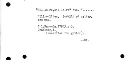 //// "Hil-le-ro,hil-le-ro" etc. //// Hillre-låten, looklåt p§. getter, //// med mel. //// Jtl.Ragunda,17933 ^ s. 3. //// Granberg^E. //// (Locklåtar for getter). //// ULM. ////