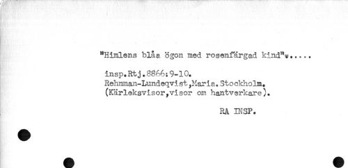 //// * //// - _ //// - //// "Himlens blåa ögon med rosenfärgad kind"?..... //// insp.Rtj.8866:9-10. //// Relmman-Lundeqvist,Maria. StockhoHja. //// (Kärleksvisor,visor om hantverkare). //// Rå INSP. ////