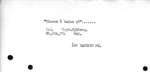 //// - //// "Hissom å halom på**....... //// .. //// f //// Uppt.Sjöberg. //// R6,2Q4,70. Mel. //// ÅBO RANCKEN MS. //// B,':', ////