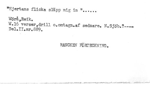 //// "Hjertans flicka släpp mig in "...... //// I-Jörå,Reik. //// M.16 verser,drill o.omtagn.af sednare. N.Sjöb.?____ //// Del.II.nr.889. //// RANCKEN %RTECKinNG. ////