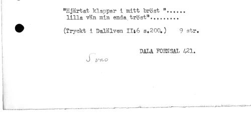 //// "Hjärtat klappar i mitt bröst "...... //// lilla vän min enda.tröst"......... //// ^ (Tryckt i Dalälven II;6 s.200.) 9 str. //// DAM FORNSAL 421. //// i //// i //// j //// ' ////