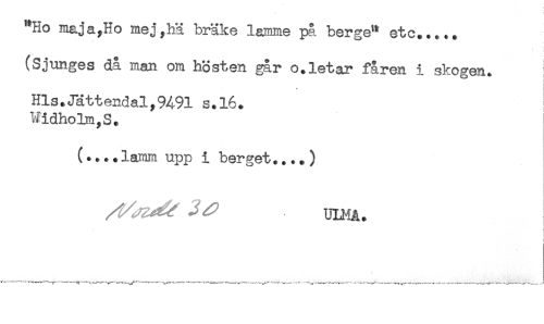 //// "Ho maja^Ho mej,h3 bräke lamme på berge* etc..... //// (Sjunges då man om hösten går o.letar fåren i skogen. //// i //// Hls.Jättendal,9A91 s.16. //// WidhoIm,S. //// (....lamm upp i berget....) //// ^ ^ ULMA. //// ***** *"" ----*.^-Y-^^^ ^..-------- --------- -........... ...........- -v---,_______-J ////
