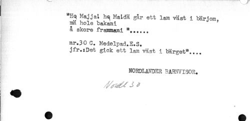 //// "Hq Maj j a L hq Ma t dä går ett lam väst i bär j om. //// mä hole bakani //// å skore frammani "...... //// nr.30 C. Medelpad.E.S. //// jfr.:Det gick ett lam väst i barget".... //// NORDLANDER BARNVISOR. ////