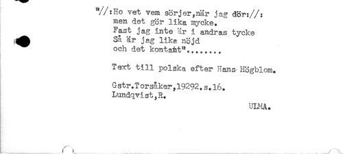 //// //:Ho vet vem sörjer,när jag dör://: //// men det gör lika mycke. //// Fast jag inte är i andras tycke //// Sa är jag lika nöjd //// och det kontait"........ //// Text till polska efter Hans- Högblom. //// Gstr.T orsaker,19292.s.16. //// Lundqvist,R. //// ULMA. //// L_______ f'L _______ ////