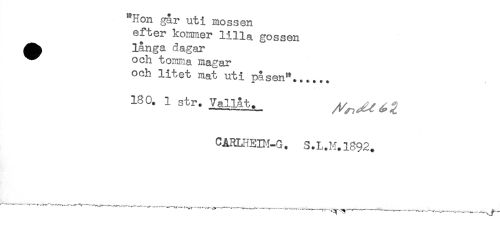 //// "Hon går uti mossen //// efter kommer lilla gossen //// ^^ långa dagar //// ^ och toinma magar //// och litet mat uti påsen"...... //// 180. 1 str. Vallåt^ //// CARLHEIM-G. S.L.M.I892. ////