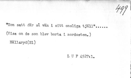 //// t //// '. ' t*' < i //// "Hon satt där så vän i sitt ensliga tjäll"...... //// (Visa om de som blev borta i nordosten.) //// Hällaryd(Bl) //// < //// L U F 4527:1. //// t //// F //// i //// C //// E //// ! //// t- ////