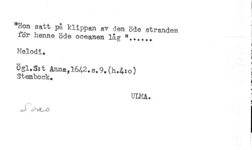 //// "Hon satt på klippan av den öde stranden //// for henne öde oceanen låg "...... //// Melodi. j //// 6gl.S:t Anna,1642.s.9.(h.4:o) //// Stenbock. j //// H //// ULMA. ; ////