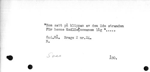 //// "Hon satt på klippan av den öde stranden //// För henne ändlöstoceanen låg //// 8:4.VA. Brage 2 nr.24,. //// N. //// g //// ^ ^ ÅBO. ////