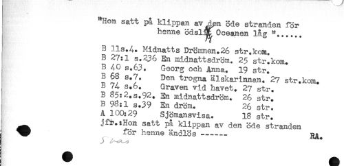 //// "Hon satt pa klippan av dpn öde stranden för //// henne ödsl^ Oceanen låg *...... //// B Ils.A. Midnatts Drömmen.26 str.kom. //// B 27:1 s.236 En midnattsdröm. 2$ str.kom. //// B 40 s.63. Georg och Anna. 19 str. //// B 68 s.7. Den trogna älskarinnan. 27 str.kom. //// B 74 s.6. Graven vid havet. 27 str. //// ' B 85:2.s.92. En midnattsdröm. 26 str. //// B 98:1 s.39 En dröm. 26 str. //// A 100:29 Sjömansvisa. 18 str. //// ! jf*.:Hon satt pa klippan av den öde stranden //// för henne änglös-------oa //// j AtA. //// } J) , -ft-o ////