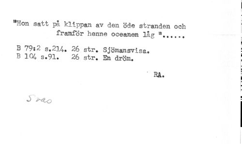 //// *'Hon satt på, klippan av den öde stranden och //// framför henne oceanen låg "...... //// B 79:2 s.214. 26 str. Sjömansvisa. ^ //// B 104 s.91. 26 str. En dröm. ! //// RA. ; //// f //// ! //// i //// ] ////