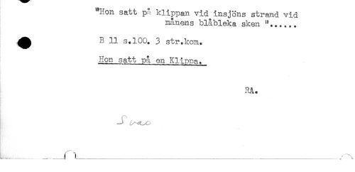 //// Hon satt pa klippan vid insjöns strand vid //// manens blåbleka sken "...... //// ^ B 11 s.100. 3 str.kom. //// Hon satt pa en Klippa. //// RÅ. //// I //// L.^______ ____ ////