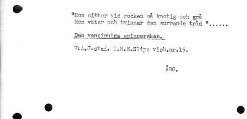 //// "Hon sitter vid rocken så knotig och grå //// Hon väter och tvinnar den surrande tråd "...... //// Den vansinniga spinnerskan._ //// * //// 7:4.J-stad. I.N.E.Slips visb.nr.15. //// ÅBO. //// . //// - ^^ * ////