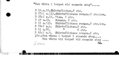 //// Hon växte i torpet vid susande skog"..... //// P-' //// B 15+s.52.Skördeflickan.8 str. //// B 27:1 s.113.Skördeflickans romans*8 str.kom. //// ^ B 28:2 s.ll.. Visa. 8 str. //// B 49 s.23. Romans. 8 str. //// B 53 s.113. Skördeflickans romans.8 str.kom. //// B 59:2 s.4. Skördeflickan.8 str. //// B 61 s.95. " 8 str. //// B 62:2 s.9. Sl^ördeflickans romans.8 str. //// jfr.tHon växte i torpet i susande skog.... //// Hon växte vid torpet vid susande'skog .... //// Tm^..... )!!!!! tAtl)!!!!^^ ////