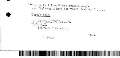 //// "Hon växte i torpet vid susande skog. //// Vad fåglarna sjöngo^det visste hon"nog //// ^ Torpflickan. //// Upl. Vä st 1,and. 2 C672. s. 5. //// Limburg^E. //// (Enstaka romanser). //// ULHÄ* //// ........*......IHHMHm^^ ////