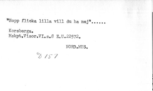 //// "Hopp flicka lilla vill du ha mej"...... //// Korsberga. //// Mskpt.Visor.VI.s.8 E.U.22572. //// NORD.MUS. //// ^ / y / //// t ////