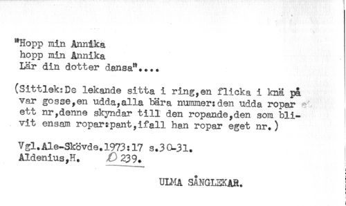 //// "Hopp min Annika //// hopp min Annika //// Lär din dotter dansa".... //// (Sittlek:De lekande sitta i ring,en flicka i knä pa //// var gosse,en udda,alla bära nummer:den udda ropar c //// ett nr,denne skyndar till den ropande,den som bli- //// vit ensam ropar^pant,ifall han ropar eget nr.) //// Vgl.Ale-SkSvde.l973:17 S.3&-31. //// AIdenius,H. ^239. //// UH-1A SÅNGLEKAR. i //// ! ////