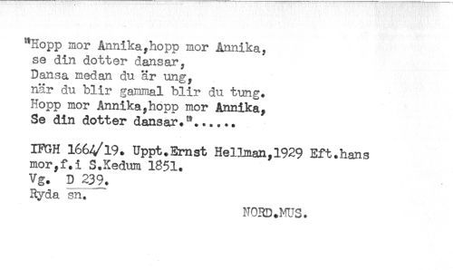 //// "Hopp mor Annika,hopp mor Annika, //// se din dotter dansar, //// Dansa medan du är ung, //// när du blir gammal blir du tung. //// Hopp mor Annika,hopp mor Annika, //// Se din dotter dansar...... //// IFGH 1664/19. Uppt.Emst Hellman,1929 Eft.hans //// mor,f.i S.Kedum 1851. //// Vg. D 239. //// Ryda sn. //// NORD.MUS. ////