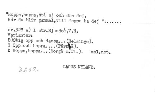 //// "Hoppa,hoppa,stå ej och dra dej, //// När du blir gammal,vill ingen ha dej //// : //// nr.328 a) 1 str.Sjundeå,V.N. //// Varianter: //// B)Stig opp och dansa...(Helsinge). //// C Opp och hoppa....(Pärn^å). //// D Hoppa,hoppa...(Borgå m.fl.). mel.not. //// ) //// t //// ! //// i //// LAGUS NYLAND. ////