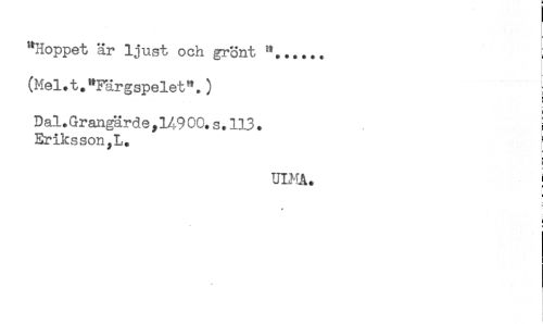 //// "Hoppet är ljust och grönt ..........: //// (Mel.t."Färgspelet".) ^ //// Dal.Grangärde,L4900.s.U3. i //// Eriksson,L. //// F //// § //// ULMA. ! //// t ////