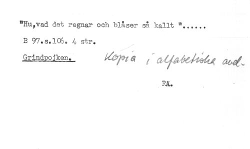 //// "Hu,vad det regnar och blåser så kallt "...... //// B 97.s.106. 4 str. //// Grindpojken. / 3 ^ //// RA. ////