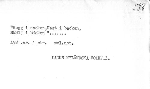 //// i //// ! //// I //// ! //// ^Hugg i nacken,Kast i backen, //// Skölj i bäcken //// 458 var. 1 str. mel.not., //// t //// ! //// LAGUS NYLANDSKA F0LKV.3. ////