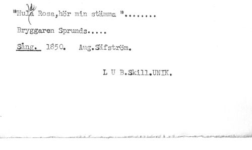 //// "HuTj^ Rosa,hör min stämma ....... //// Byggaren Sprunds..... //// Sang. 18 5 0. Aug. m f s t röm. //// L U B.Skill.milK. ////